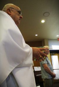 Father Ron processing with oil before the blessings, with Sean standing by.